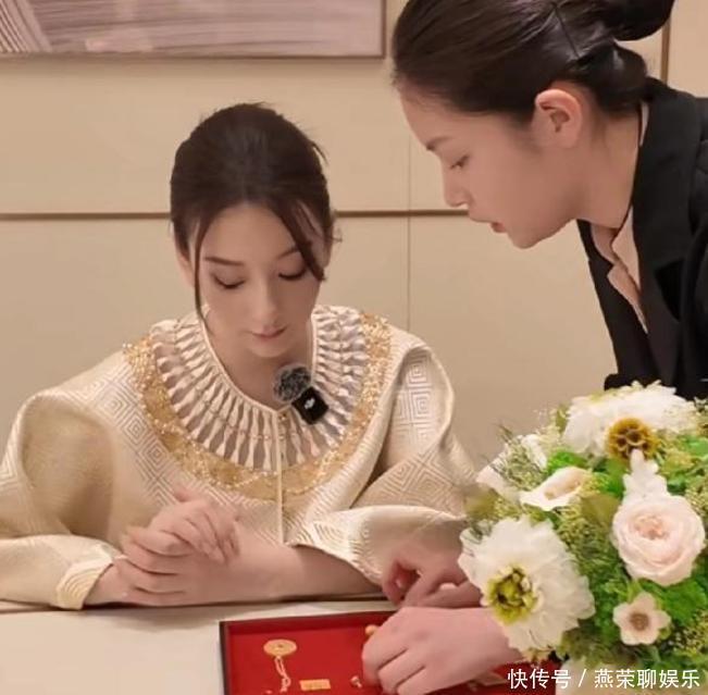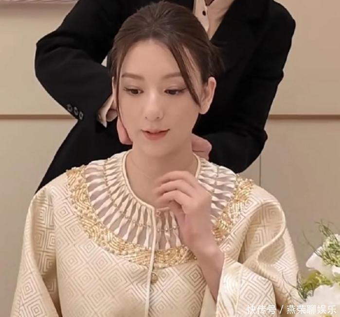 当日方媛的穿搭堪称国风与奢华的完美融合。金色套装上衣绣有精致回纹暗纹,领口褶皱纱与珍珠拼接,既有东方古典韵味,又透着现代轻奢感;垂坠感极佳的阔腿裤衬得身姿愈发挺拔,低髻发型露出流畅颈线,白皙肌肤在金饰灯光下更显通透。整套造型与金店氛围相得益彰,行走间宛如从古典画卷中走出的贵女,气场全开却不张扬。